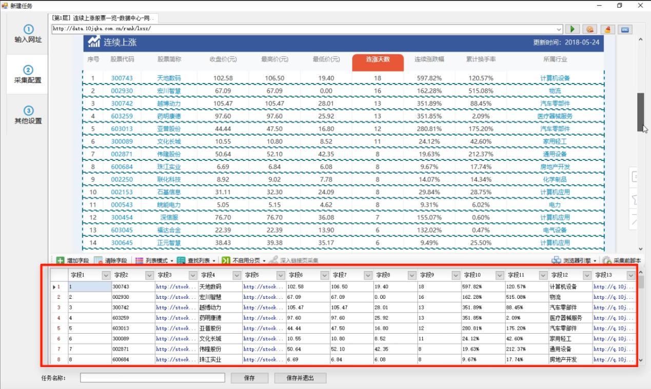 8、之后系统会在界面下方字段列表中对应标题和链接分别生成两个字段,当用户选择这两个字段标题时,上方网页列表中会以黄色底纹高亮显示对应匹配的内容。用户可以添加多个字段,操作类似。