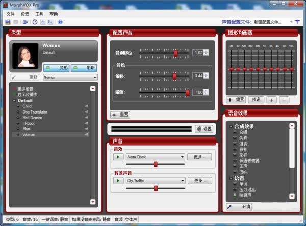 没错,MorphVox除了能让猛 男变萌妹音,也是可以让妹子变汉子声的!点选了某个变声方案后,可以看到“配置声音”中的几个选项都会有所变动。这几个选项意味着什么呢?我接着说。