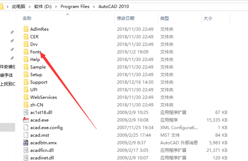 打开【Program Files】文件夹,找到【AutoCAD 2010】文件夹,将其打开,然后找到【Fonts】文件夹,