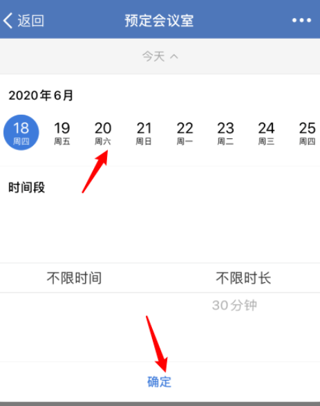 进入预定会议室服务窗口,点击上方的时间选项,选择预约时间,点击确定,