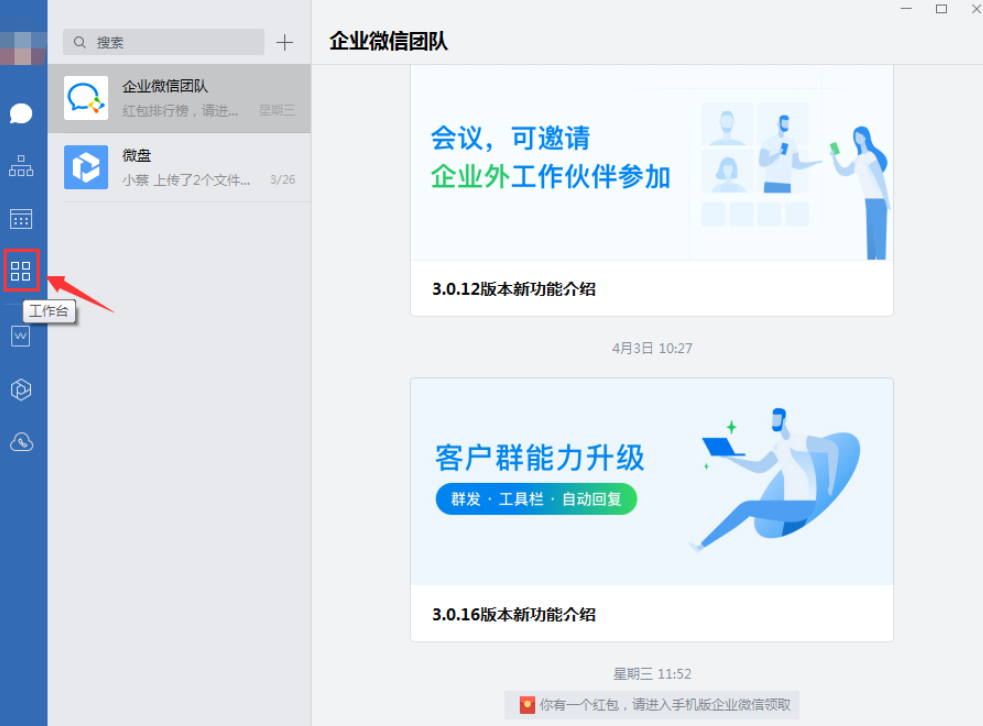 在电脑中打开企业微信,登录客户端,进入首页,在左侧栏点击【工作台】图标,