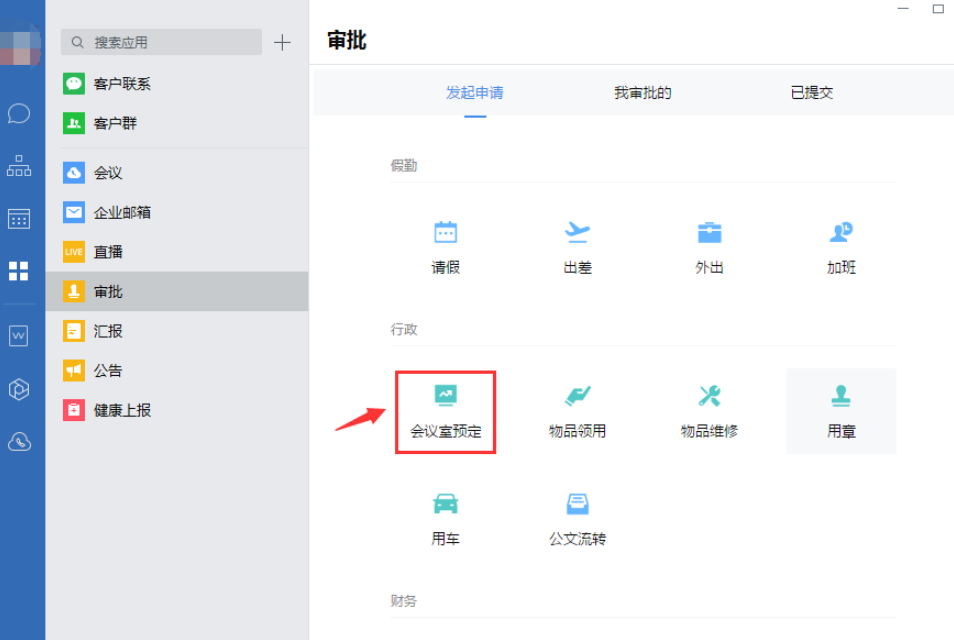 弹出菜单列表,点击【审批】,选择【行政】——【会议室预定】选项,