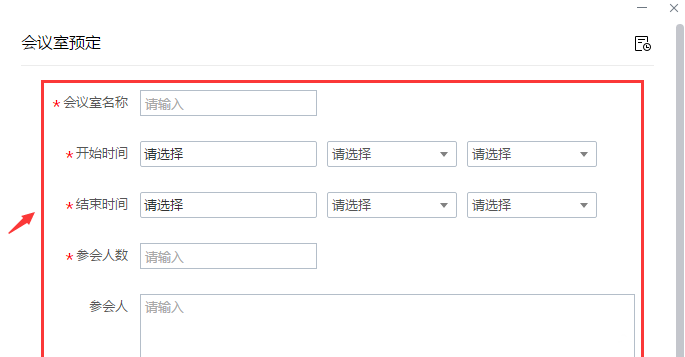 弹出窗口,如图,填写相关信息,包括会议室名称、开始时间、结束时间、参与人数和参会人等,