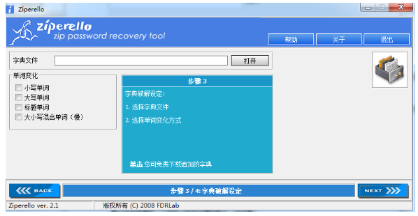 选择【字典破解】,如图,选择字典文件,选择单词变化方式,