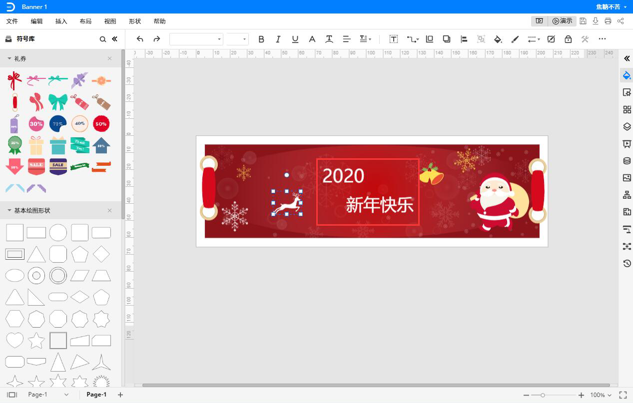 3、用户在用亿图软件制作宣传横幅时,可以通过左侧的“符号库”选择适合自己的元素,将它拖拽到右侧横幅的合适位置再放手,该元素便会添加至横幅上。而如果需要应用某个形状,也可以点击该形状,再在横幅中按住鼠标左键进行描画。