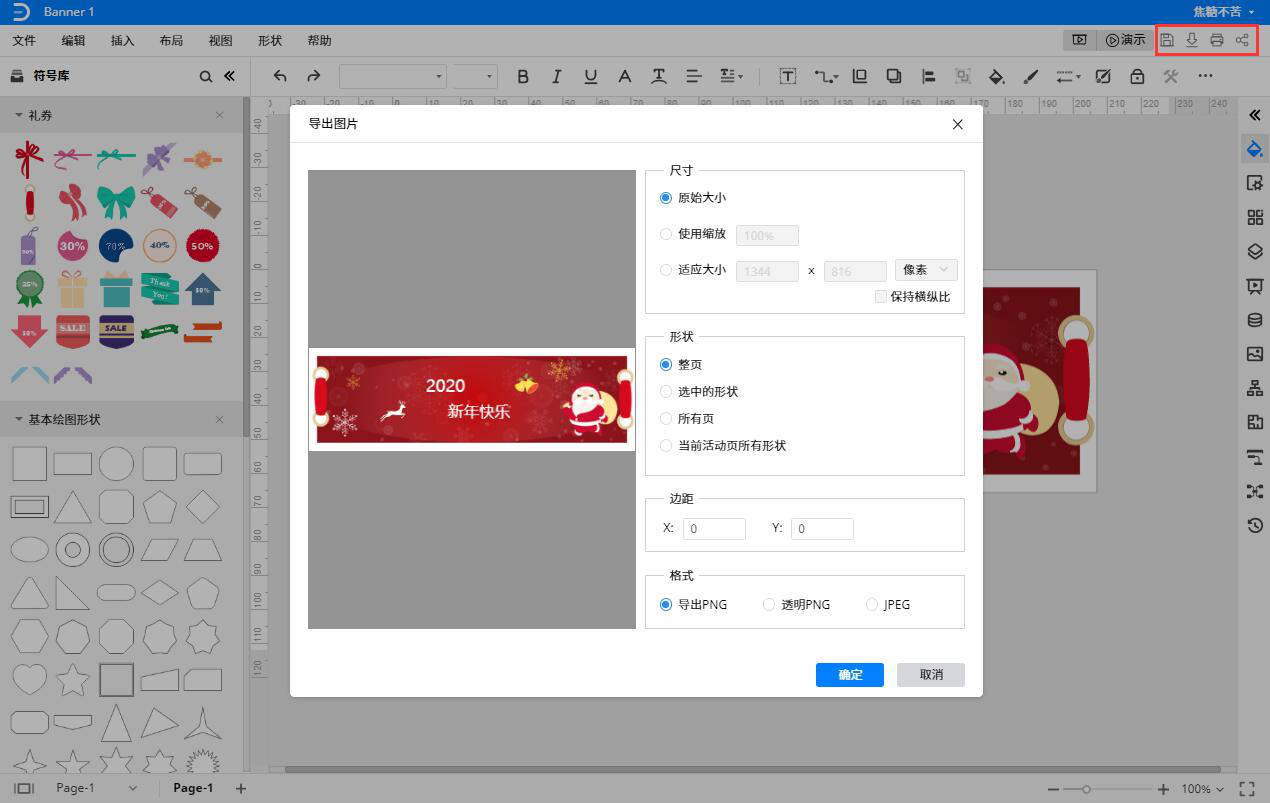 5、最后,亿图软件制作宣传横幅完成后,用户可以根据自己的需要点击软件右上方的“保存”、“下载”、“打印”、“我来教你”功能按钮,进行相关的操作。例如点击“保存”时,会弹出如下图的导出图片窗口,用户设置完成后,点击“确定”按钮即可。