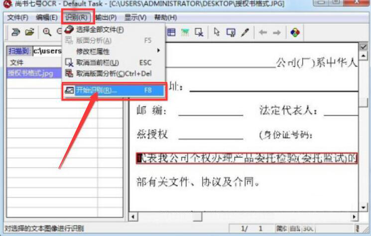 4、选好文字内容,点击“识别”菜单中的“开始识别”,尚书七号OCR便开始执行识别文字的指令。