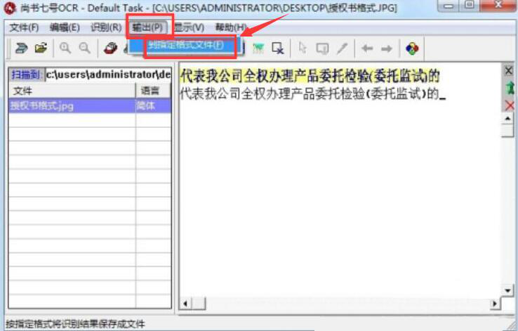 5、尚书七号OCR识别文字完成,用户点击“输出”菜单中的“到指定格式文件”。