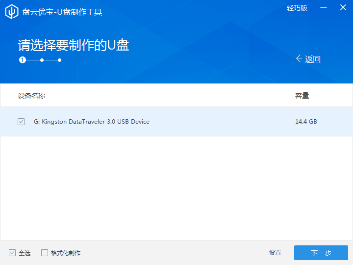 2、点击【优宝旗舰版制作】或【优宝轻巧版制作】,选择要制作的U盘设备,之后点击【下一步】。