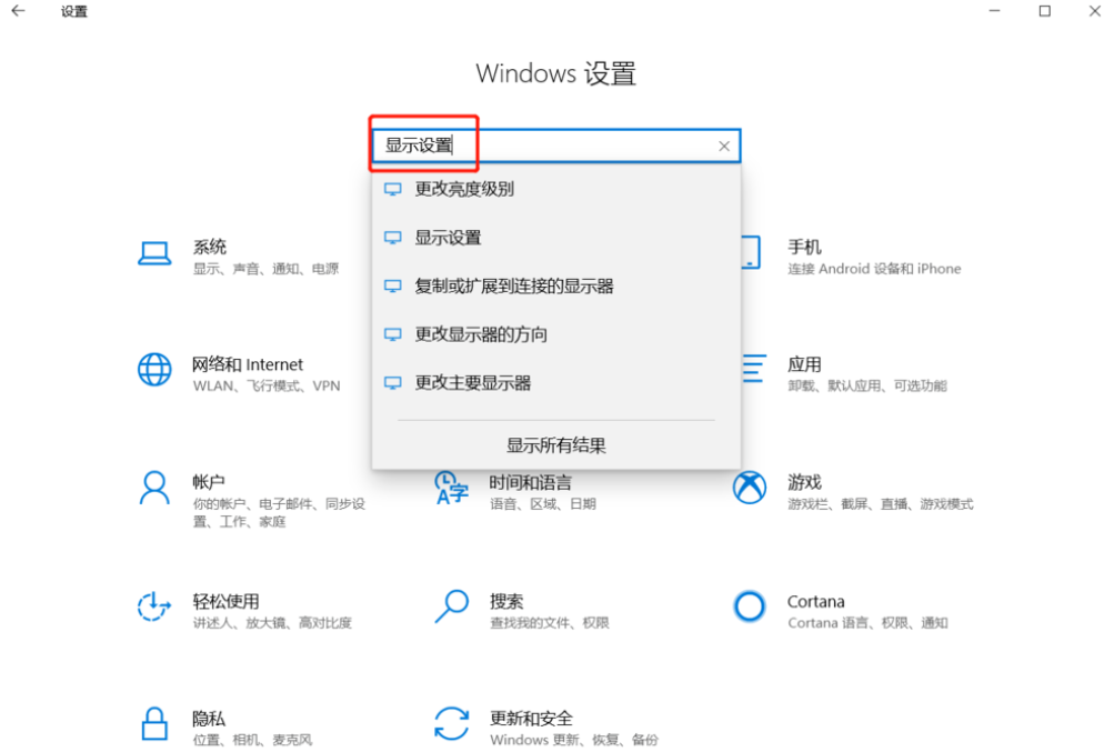 呼出开始菜单,点击【设置】,打开Windows设置面板,如图,在搜索框中输入【显示设置】,进行查找,