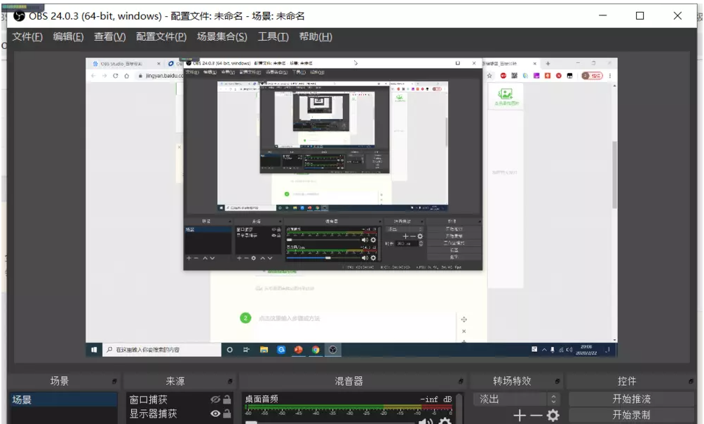 现在重新打开OBS Studio软件,设置场景、来源,如图,录屏黑屏问题解决了。
