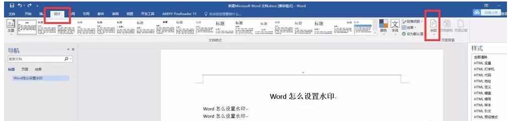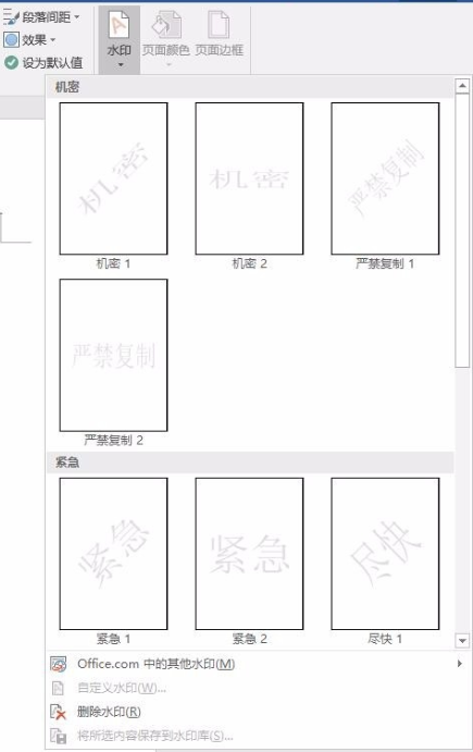 在上方菜单栏中点击【设计】——【水印】功能,展开下拉列表,选择水印类型,选择自己喜欢的水印,