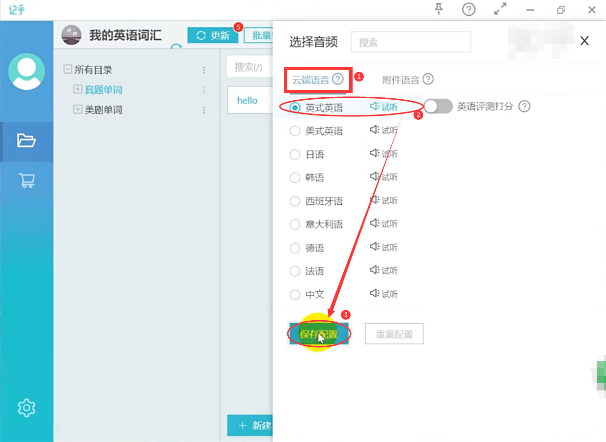 1)添加云读语音。选择【云读语音】,然后在语言选项列表中勾选需要的语音语种,比如这里勾选【英式英语】,可以点击【试听】,听听效果,然后点击【保存设置】。