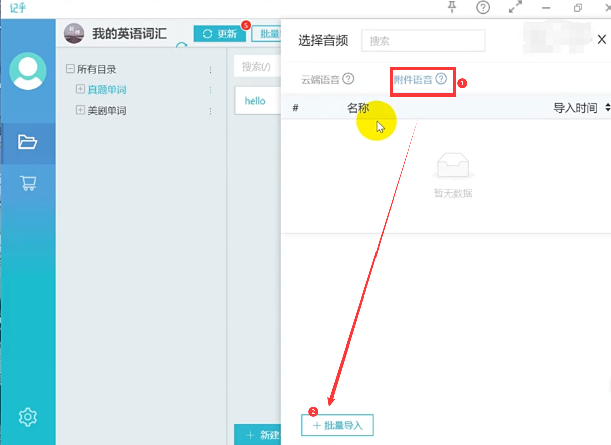 2)添加附件语音。选择【附件语音】,点击【批量导入】,添加本地语音附件即可。