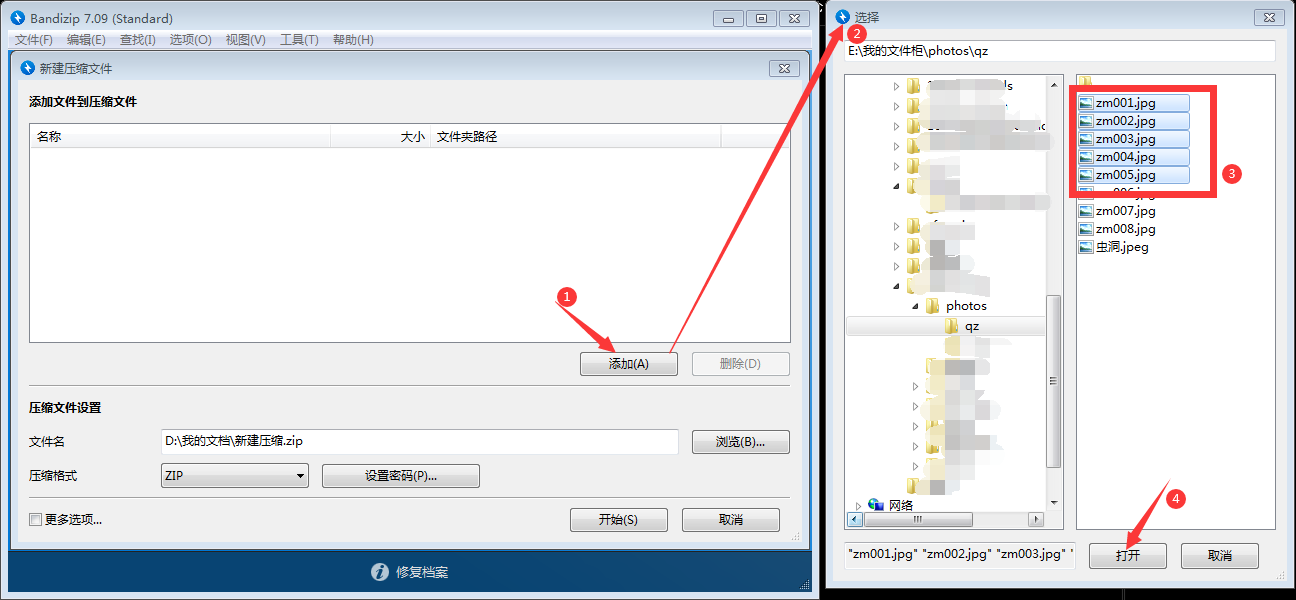 3、弹出新建压缩文件窗口,点击【添加】,浏览选择需要压缩的文件,然后点击【打开】,即可将压缩文件添加到窗口列表。