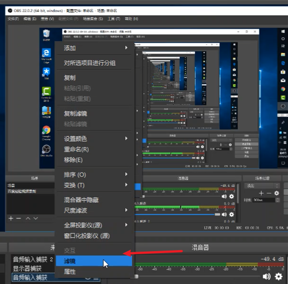 使用鼠标右击【音频输入捕获】来源,弹出菜单,选择【滤镜】,