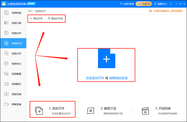 进入视频转GIF页面,导入之前准备好的视频文件,这里上有多种添加文件的方式,大家可以自行选择,