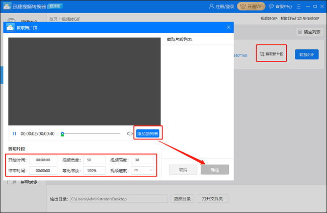 视频文件添加之后,点击【截取新片段】,即可弹出窗口,设置相关参数,例如剪切片段开始和结束时间,设置完成,点击【添加到列表】,进行确定,