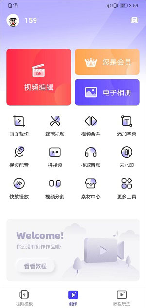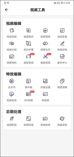 下载安装清爽视频编辑器,打开软件,进入主界面,这里有多种功能,如画面剪切、剪辑视频、视频合并、添加字幕,点击【更多工具】,选择【特效编辑】——【GIF动图】,