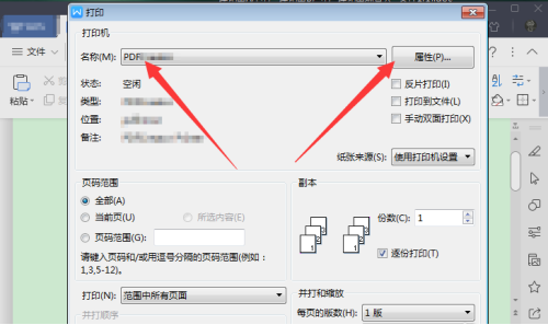 4、弹出打印窗口,在打印机名称一栏中选择PDFCreator虚拟打印机,并点击右侧【属性】。
