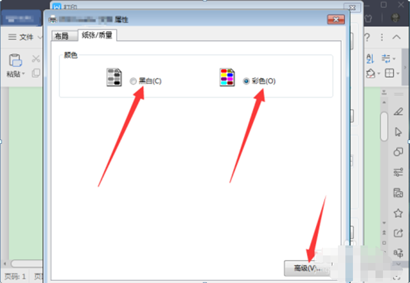6、选择【纸张/质量】标签,打开该标签页面,一般默认黑白,然后点击右下方【高级】。