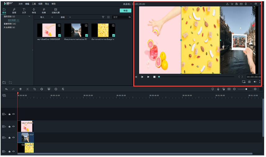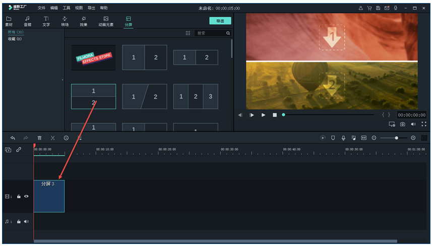 鼠标双击轨道上的分屏效果,进入编辑窗口,然后将媒体库中的视频素材拖拽到相应的分屏模板拆分区域,如图,