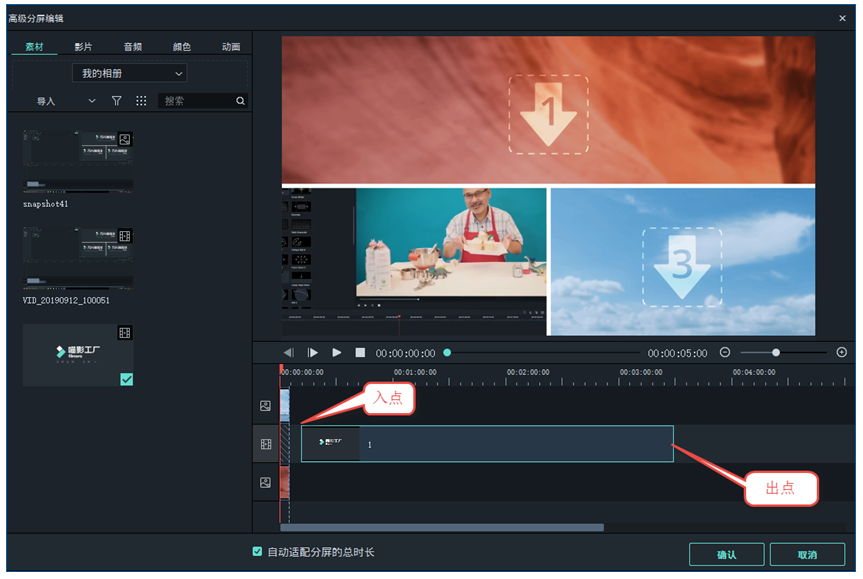 点击【高级编辑】,进入高级分屏编辑窗口,在预览框下方编辑轨道,用于调节视频的出入点,