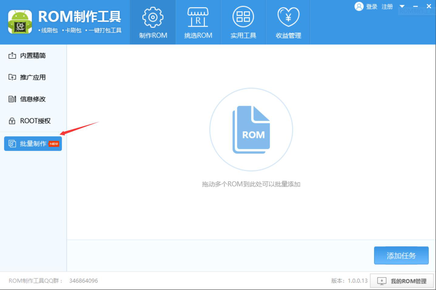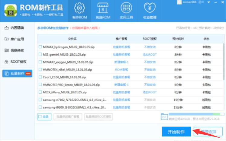 1、首先,用户打开ROM制作工具,在主界面左侧向导栏中点击“批量制作”,从而进入基础ROM制作的环节。