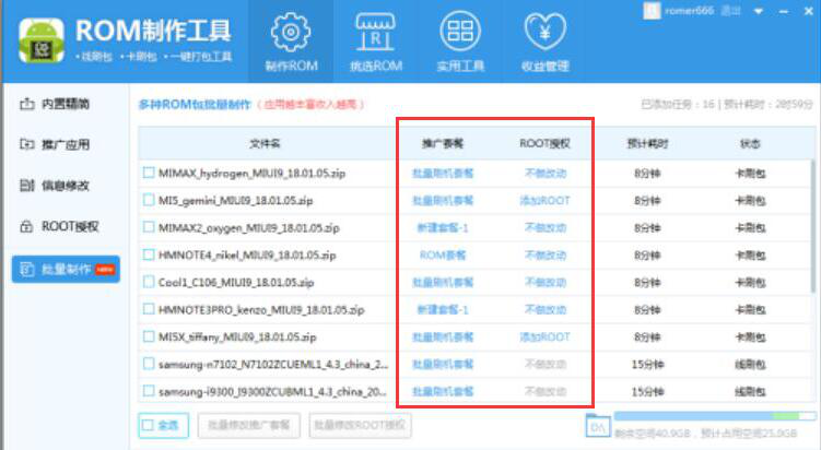 3、接下来,用户就可以根据自己的需要来设置“推广套餐”和“ROOT授权”,可以设置单个基础ROM包,也可以设置多个。