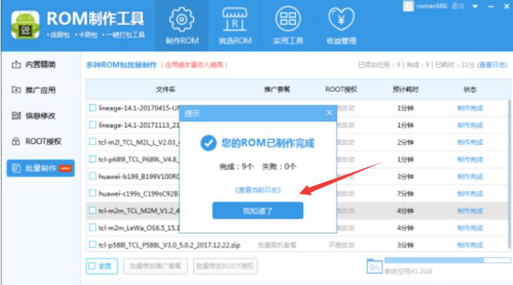 5、最后,当ROM制作工具弹出如下图的窗口提示时,说明基础ROM制作成功,用户直接点击“我知道了”的按钮即可。
