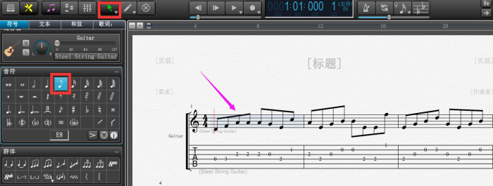 2、打开一个空白吉他乐谱,使用左侧的工具面板中的符号完成乐谱输入。为了方便观察和输入,可以点击图中最上方箭头图标改变音符显示大小比例。