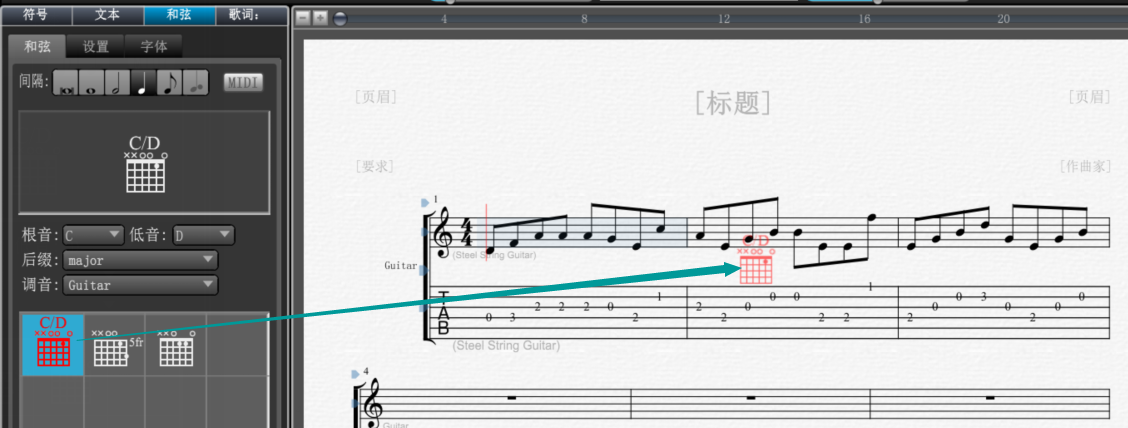 4、设置了和弦参数,点击选择设置好的和弦符号,将其拖拽到曲谱中需要添加和谐的位置即可。
