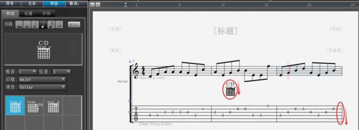 1)设置和弦间隔音,比如将四分音符作为间隔音(如图)选择为乐谱添加和弦。