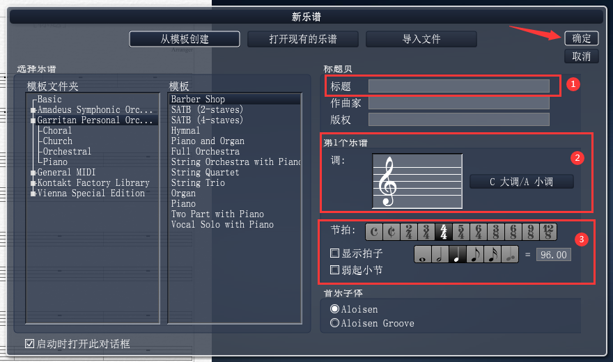 3、在“新乐谱”窗口右侧对乐谱标题、乐谱的乐器、节拍等基本信息进行设置,这些信息在后续是可以修改的,所以大胆的设置,设置完成后点击【确定】。