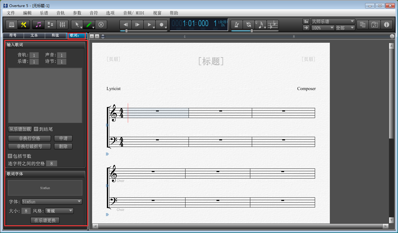 4、接下来就会弹出乐谱编辑界面,这里我们需要重点介绍一下左侧工具面板,它包括符号、文本、和弦、歌词四个页面。
