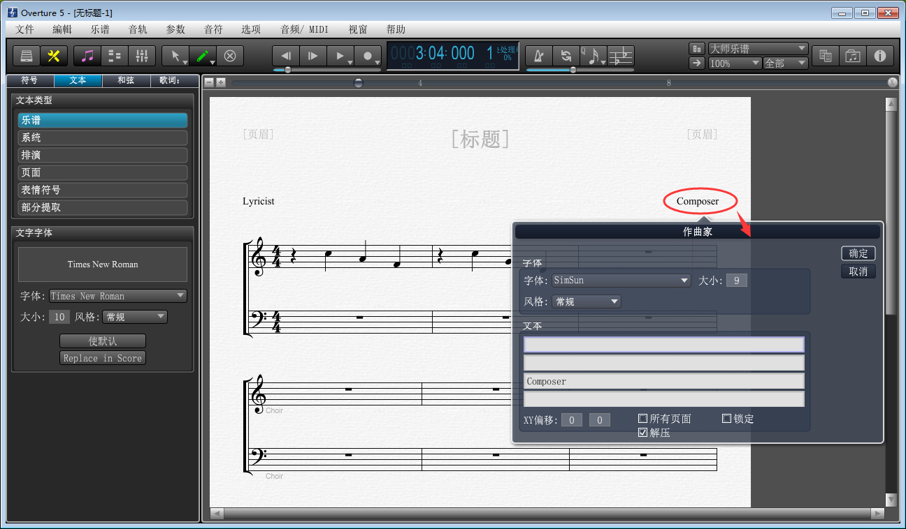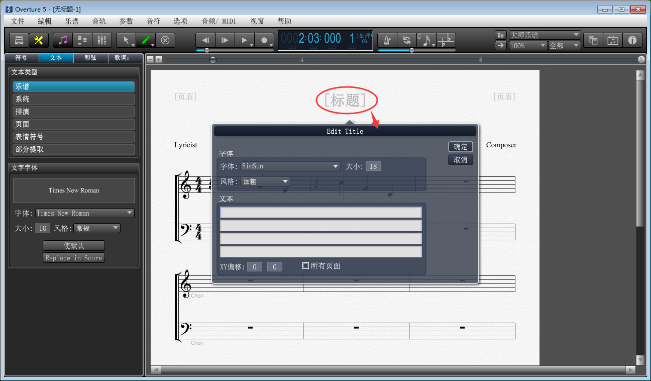 6、乐谱输入完成后,点击工具栏中的【文本】,选择文本类型【乐谱】,然后点击右侧乐谱中的标题、作曲家等文本信息,会弹出对应的文本编辑窗口,用户可以在这些窗口中对文本的内容、字体、字体大小、风格等方面进行设置调整。设置完成点击【确定】。