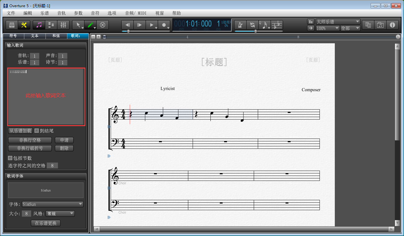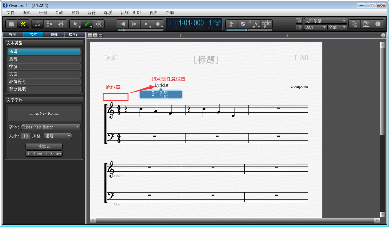 7、文本设置完成,可以按照阅读习惯,通过鼠标点击拖动调整右侧乐谱中文本位置。