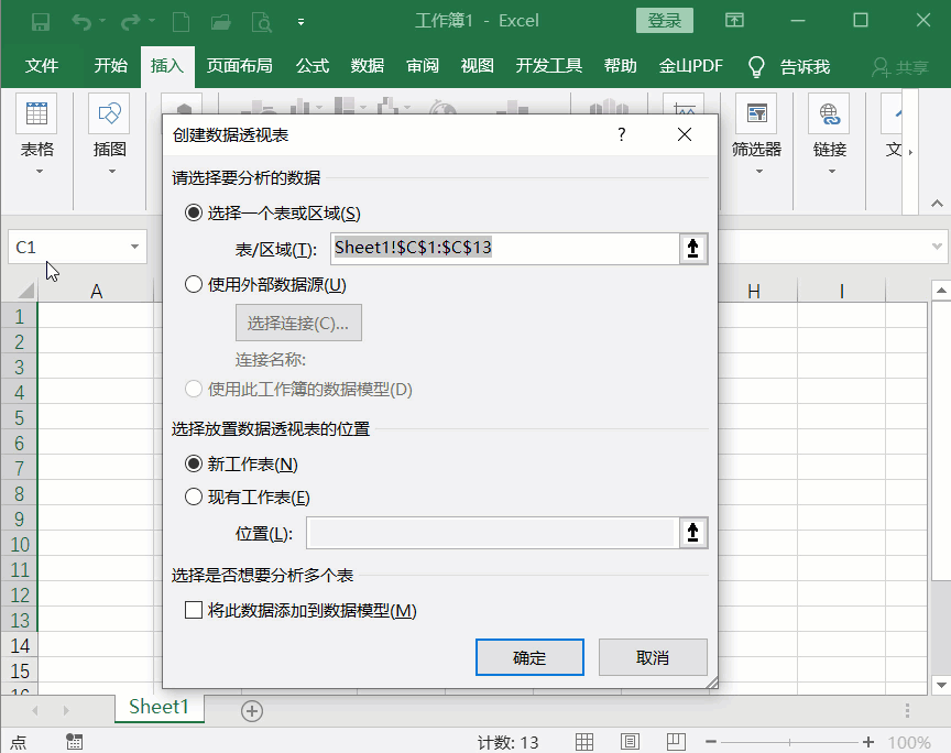 2、选中【C1:C13】单元格,在菜单栏中点击【插入】——【表格】——【数据透视表】选项,