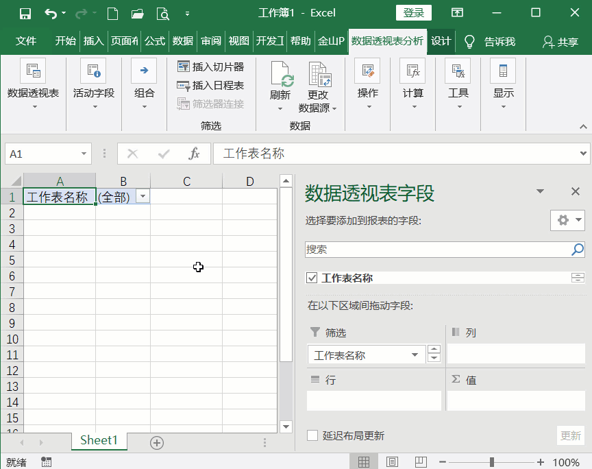 4、如图,工作区右侧出现了【数据透视表字段】窗口,鼠标点按【工作表名称】不放,将其拖到【筛选】区域,