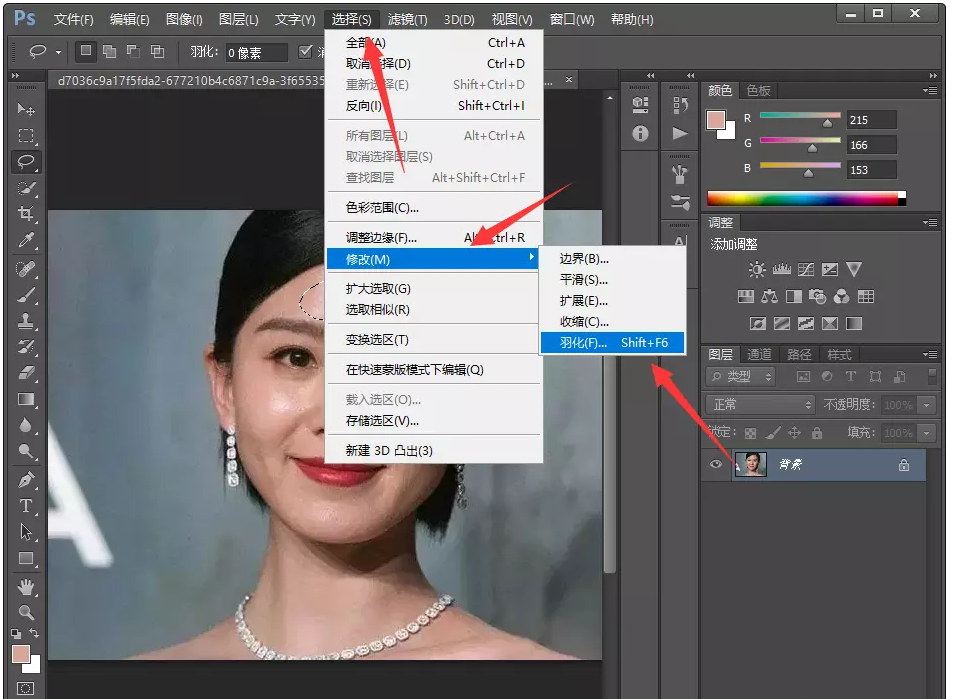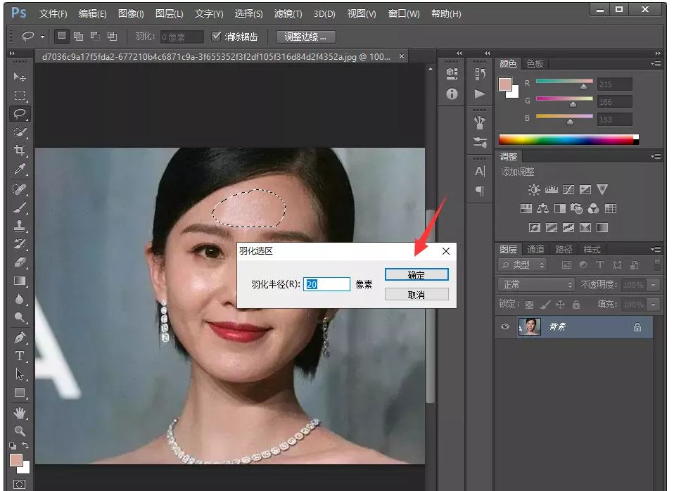 在PS软件菜单栏点击【选择】——【修改】——【羽化】命令,弹出【羽化选区】面板,设置像素为20,点击确定,