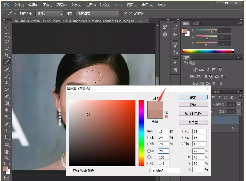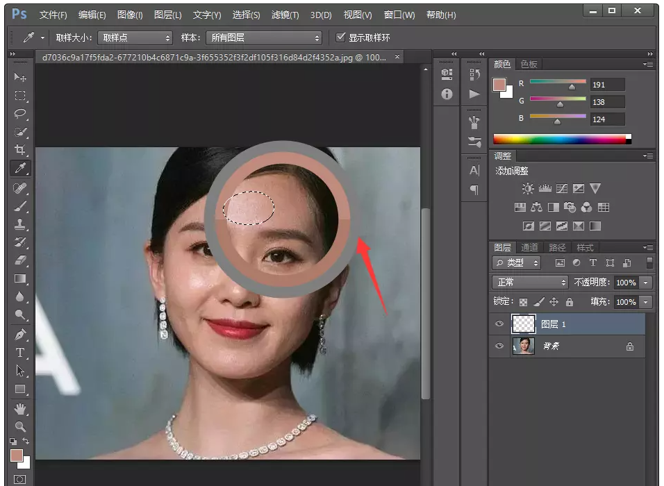 然后在左侧工具栏点击【吸管工具】,使用鼠标点击正常皮肤,吸取皮肤颜色,如图所示,