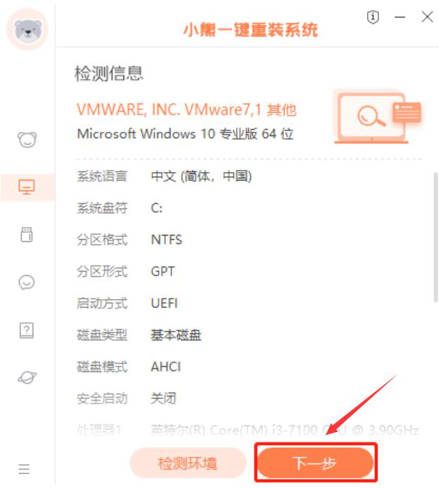 2、此时,小熊一键重装系统会自动检测用户的电脑是否符合重装Win10的条件,检测完成,点击“下一步”按钮。
