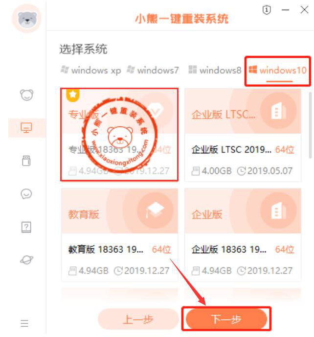 3、然后,进入选择系统环节,切换至“Windows10”页面,从中选择用户所需的Win10版本,例如装的Win10是专业版,就点击专业版,再点击“下一步”按钮。