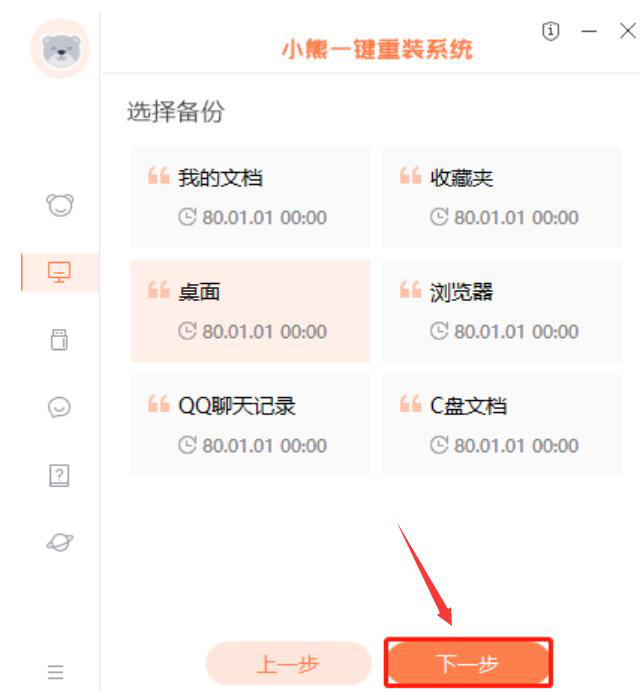 5、接下来,用户在小熊一键重装系统的选择备份页面中,选择自己想要备份的数据进行备份,再点击“下一步”按钮。