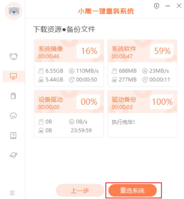 6、此时,小熊一键重装系统便开始下载系统镜像、驱动、系统软件,如果用户临时想更换重装的Win10版本,就点击“重选系统”按钮。如果不换,就静待它下载完成。