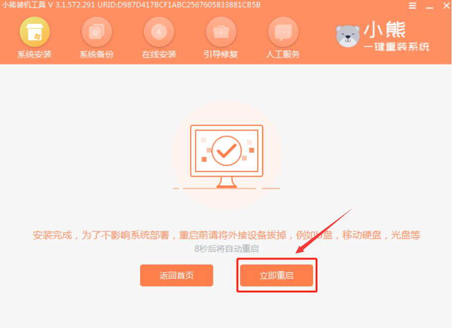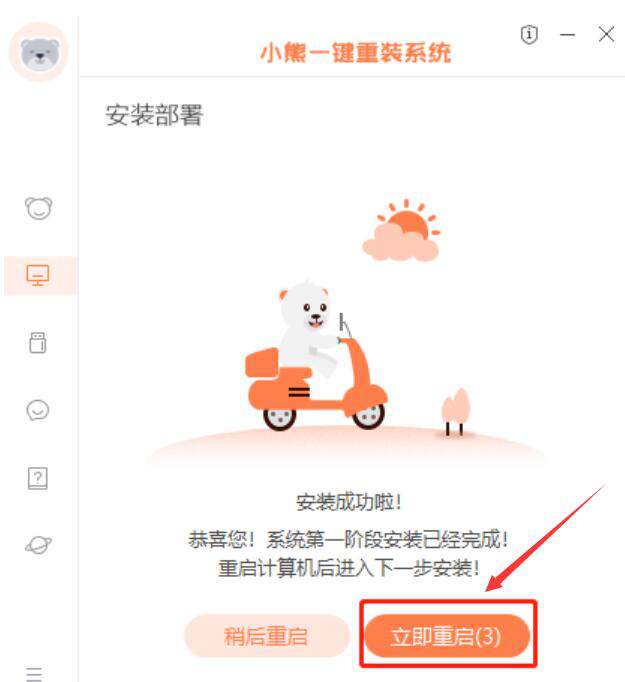7、完成下载,小熊一键重装系统会自动进行安装部署,安装完成,点击“立即重启”按钮。