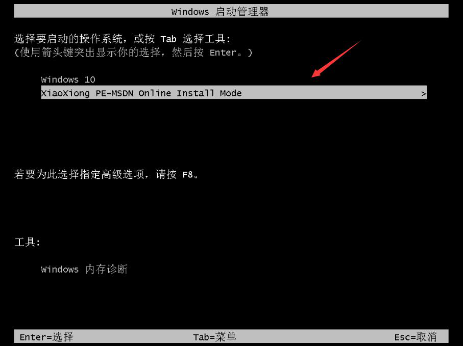 8、电脑重启后,在Windows启动管理器中,点击“XiaoXiong PE-MSDN Online Install Mode”进入系统。