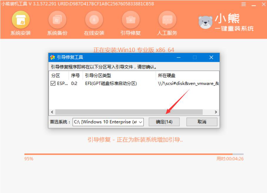 9、进入系统,小熊一键重装系统会自行安装Win10系统,在安装时会弹出如下图的窗口,点击“确定”按钮。