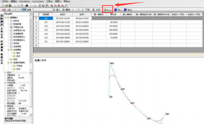2、绘制完成,点击道路之星界面上方的“Excel”,用户可以看到道路的具体坐标和半径信息。