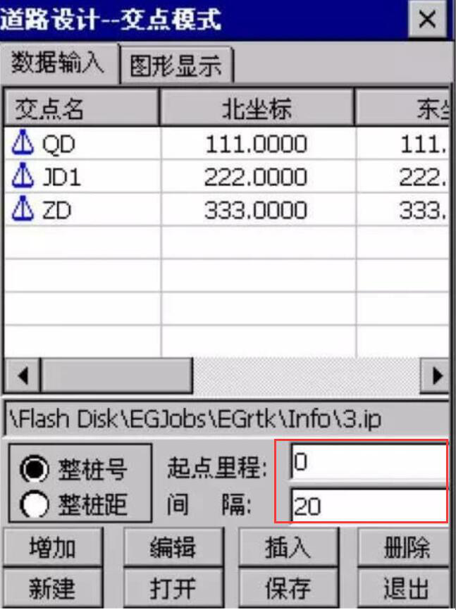 6、将手簿打开,利用工程之星新建一个交点模式的道路设计文件,在起点和间隔处随便输入数值。